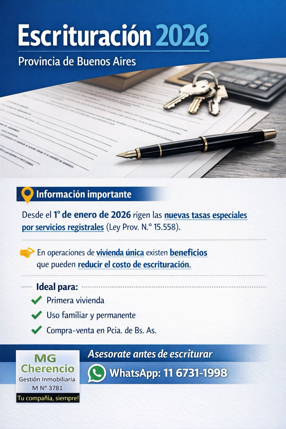 📌 El Registro de la Propiedad Inmueble de la Provincia de Buenos Aires publicó en su sitio oficial una noticia donde se indica que a partir del 1° de enero de 2026 comienzan a regir las nuevas tasas especiales por servicios registrales, las cuales fueron aprobadas por la Ley Provincial N.º 15.558. Esta actualización forma parte del régimen fiscal aplicable a los trámites registrales relacionados con inmuebles.